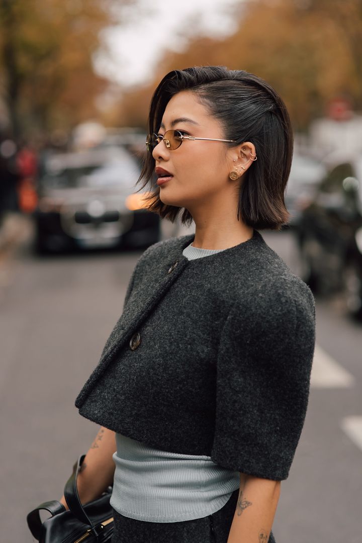 タイトにまとめたサイドパートが、クロップド丈のシックな装いに調和。ウエットな質感も凜とした仕上がり。