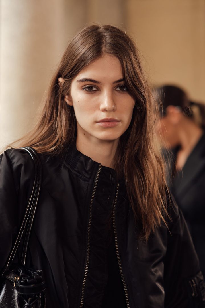 ラフに下ろした自然体なロング。自然なクセと透明感のあるカラーがブラックコーデに軽やかさを生む。