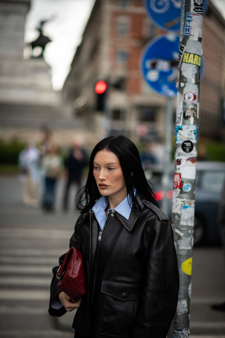 ストレートな黒髪をセンターパートに。レザーの武骨さとブルーシャツの清潔感が、エッジィなコントラストを演出。