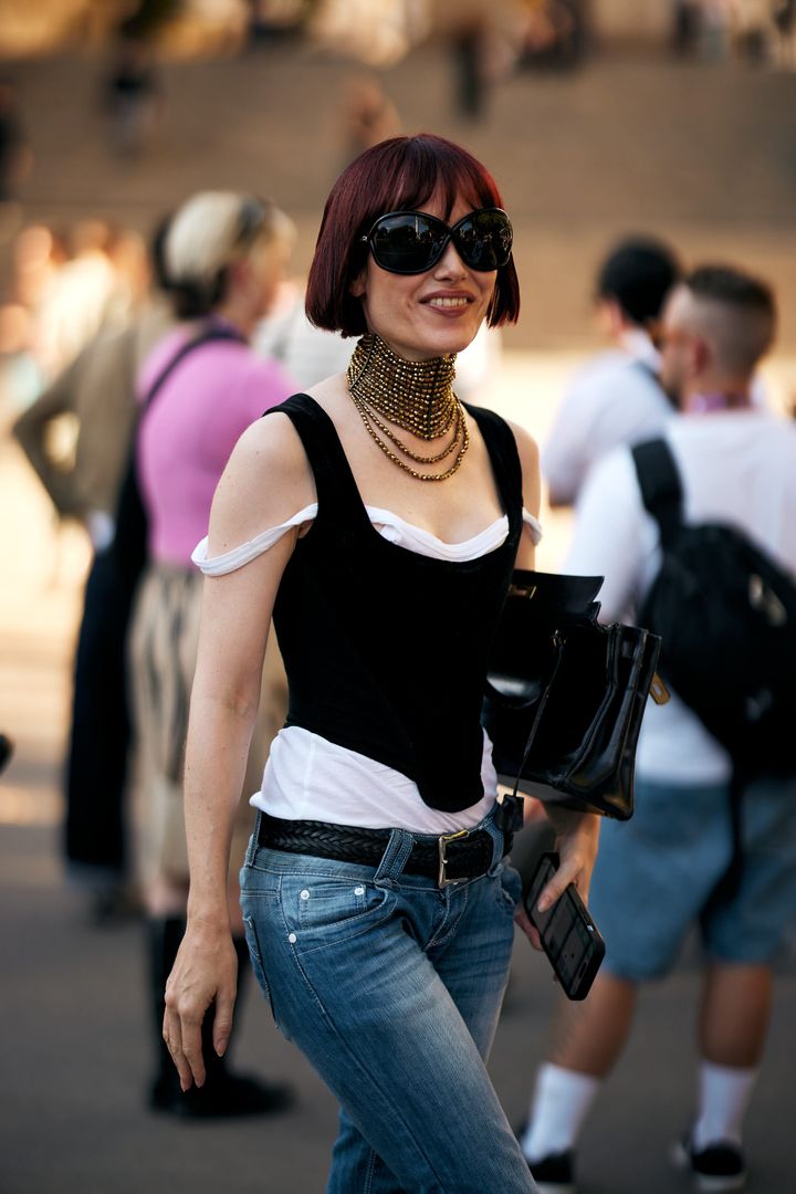 鮮やかなボルドーボブが、ストリートなデニムスタイルをモードに昇華。ビッグサングラスを主役に、強気な個性を主張。