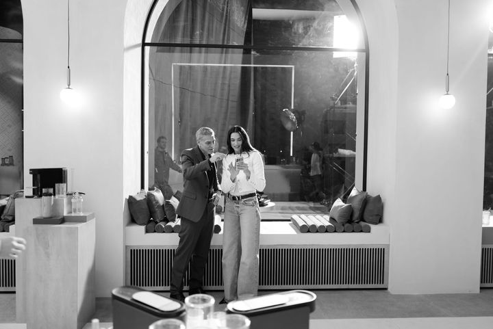 CM撮影の舞台裏でコミュニケーションを取るジョージ・クルーニーとデュア・リパ。 Madison Phipps