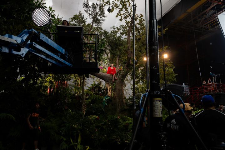 大木の上に座り撮影に挑むデュア・リパ。 Madison Phipps