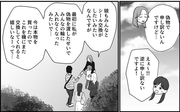 “ぷっくりシール”の偽物を購入し、なにも知らないまま他の子どもたちとシール交換をさせてしまっていたというメイちゃんママ。そしてそのお詫びに偽物だけれど、可愛いシールをみんなにプレゼントしたいと言ってきたのです。