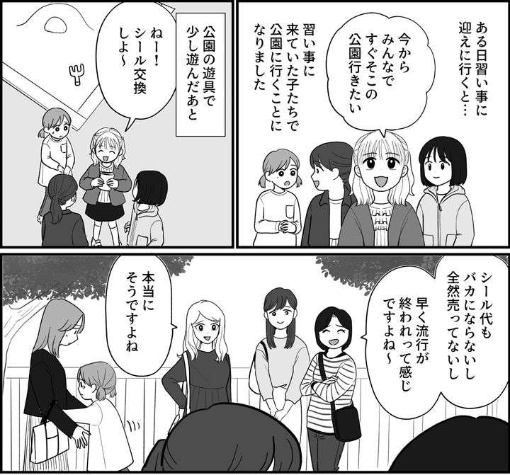 ある日の習い事のお迎えのとき。帰るまえにみんなで公園で遊んでいくことになりました。シール交換をしている子どもたちを見守りながらママたちで雑談をしていました。すると、メイちゃんのママが話しかけてきたのです。