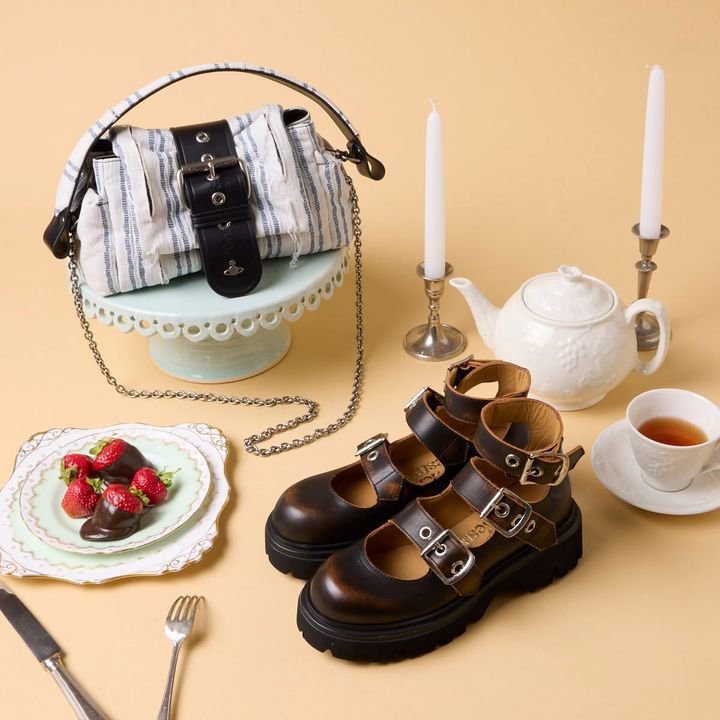 “ヘーゼル トレジャー”バッグ(W28×H16×D10cm)¥176,000、シューズ(H4cm)¥132,000/ヴィヴィアン・ウエストウッド Hearst Owned