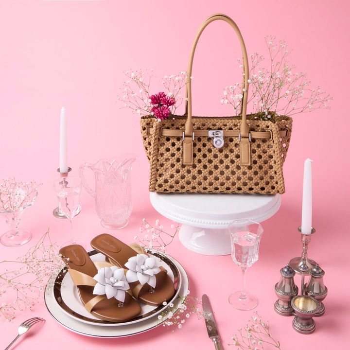 “ハミルトン・モダン”バッグ(W32.5×H18.5×D12.5cm)¥68,200、フラワーチャーム¥20,900、シューズ(H4cm)¥31,900/マイケル マイケル・コース(マイケル・コース カスタマーサービス) Hearst Owned
