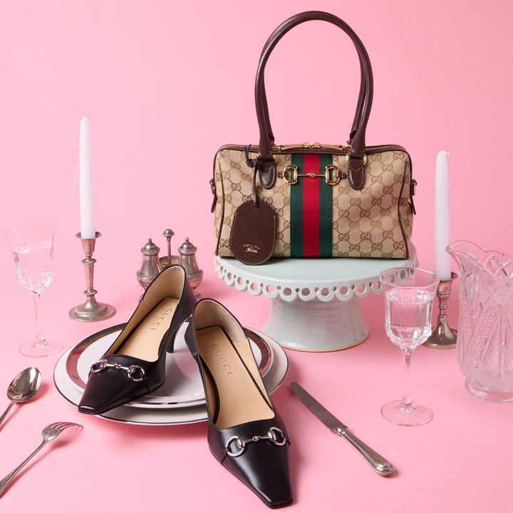 STYLIST RIE'S VOICE:「ヴィンテージライクなムード漂う“グッチ ボルセット”は、あえて気負わずデイリーに持ち歩くのがおしゃれ! 足もとには、レトロな表情がたまらない“ヴィットーリア”パンプスを。バッグのクラシックな重厚感と、パンプスの軽快なトレンド感がミックスされることで、今季らしい最高にフレッシュなグッチ・スタイルが完成します」