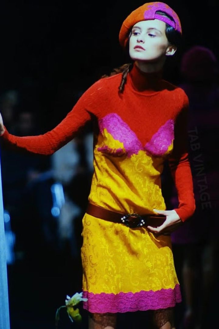 Vネックのラインとクリアストラップ、そしてピンクのレースのディテールが施されたシルクのスリップドレスは、イタリアの令嬢、マルケッサ・カサティにインスパイアされた1998-99年秋冬コレクションで発表されたもの。1920年代と1990年代を融合させた豪華なコレクションだ。ランウェイでは大胆なカラーミックスと演劇的なスタイリングが披露され、当時、このドレスにテラコッタカラーのタートルネック、お揃いの帽子、そしてブラウンのベルトが合わされていた。しかし、ヘイリーはこれを一枚でさらりと着こなし、秋らしい一着を見事に春の装いへと昇華させた。