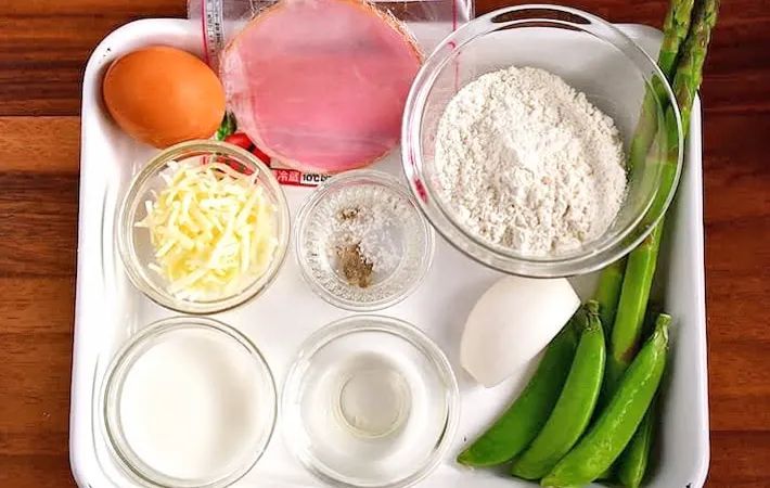 アスパラは根元を落として硬い部分の皮を薄く剥き、スナップエンドウはヘタと筋を除いて、それぞれ3㎝程度の斜め切りにします。新タマネギは粗みじんに、ハムは1cm角に切りましょう。