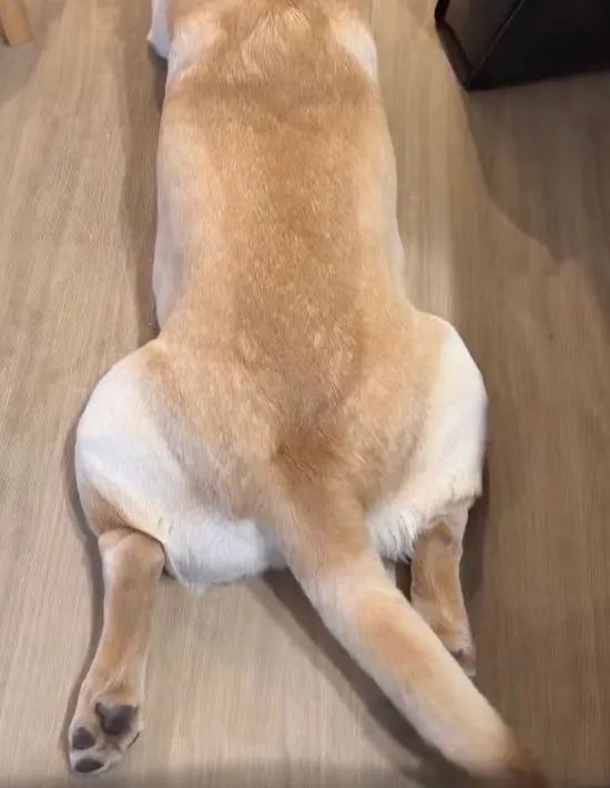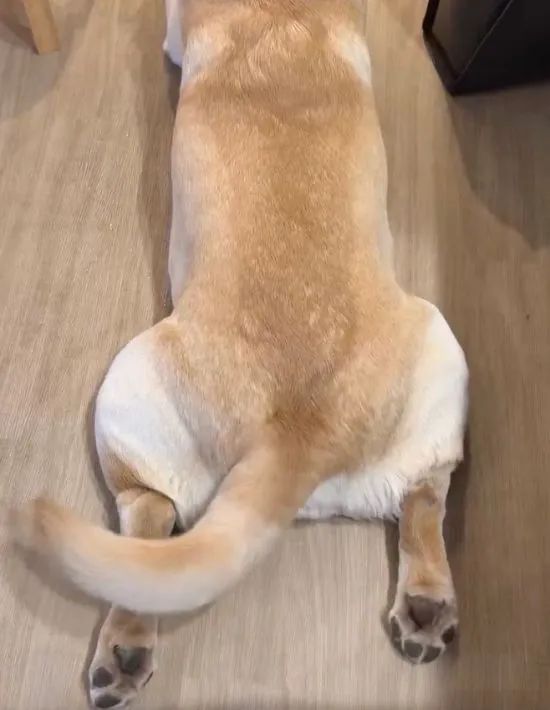 床に寝そべる横綱くん。尻尾は、真っ直ぐだらんとしています。