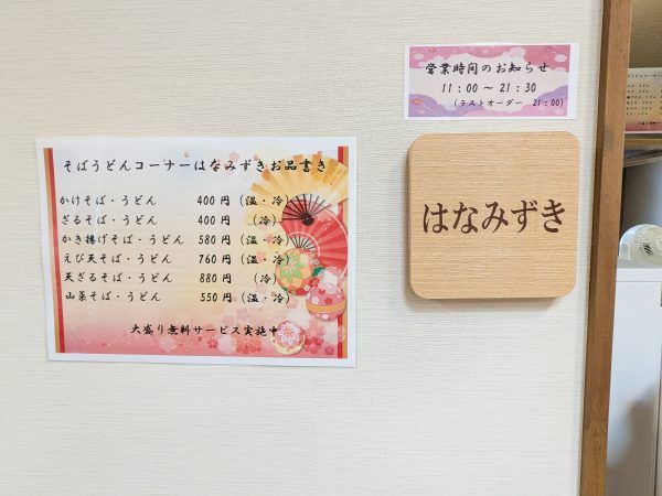 蕎麦「はなみずき」では、うどんもいただけます。 こちらは大盛り無料!