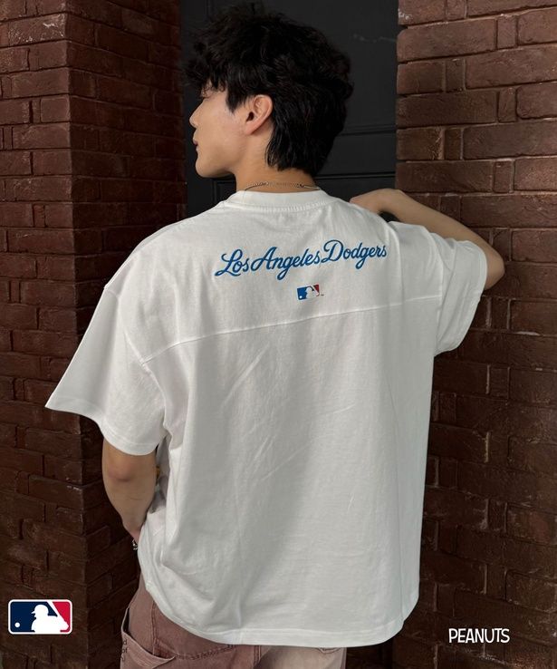 「MLB×PEANUTS 加工ラグランTEE」(8250円)は、ドジャースのみの1カラー展開という珍しい1枚。ヤシの木が並ぶロサンゼルスの風景をバックに、サングラス姿のジョー・クールがチルな表情でくつろぐイラストがプリントされている。かすれプリントとピグメント加工でヴィンテージ感たっぷりに仕上げられていて、着るだけで夏のLAムードが漂う。シャツを羽織ってレイヤードするスタイリングとも相性抜群だ。