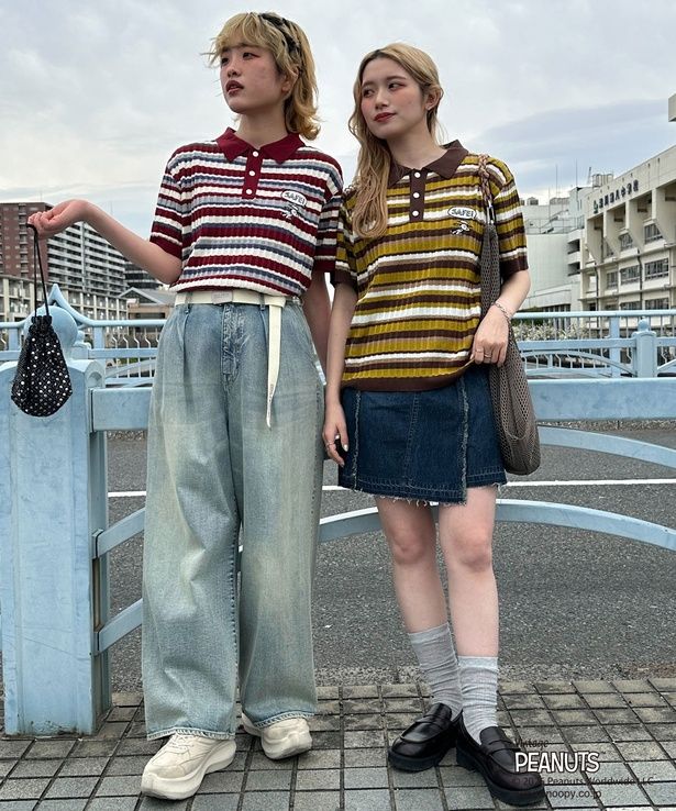「PEANUTSコラボ マルチボーダーポロ衿ニット(レッド系)」(9350円)