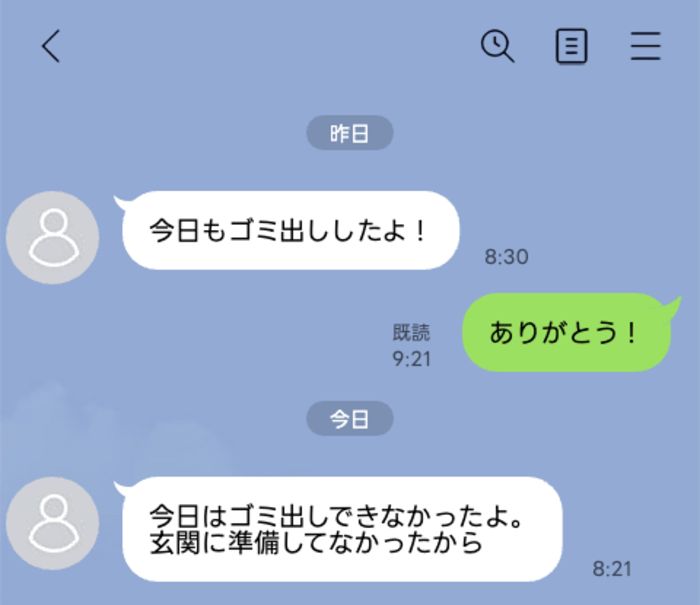 「今日はゴミ出しできなかったよ。玄関に準備してなかったから」