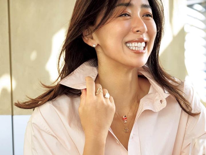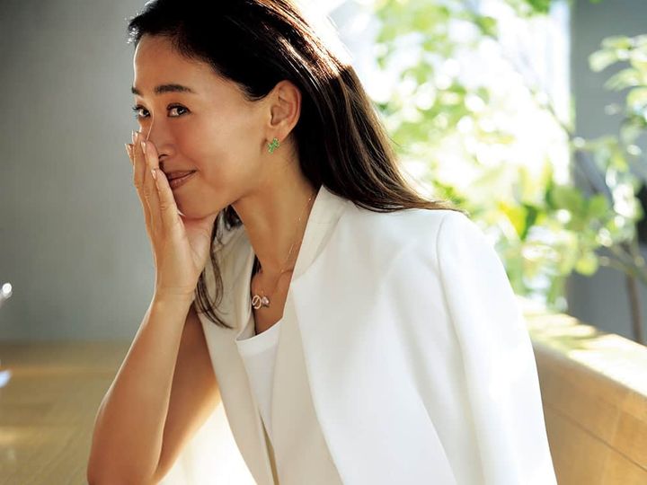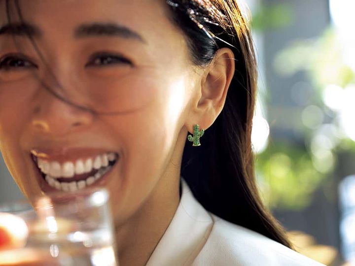 サボテンピアス[左耳/片耳価格]¥203,500 桃ネックレス¥366,300 「の」ネックレス¥315,700(すべてビジュードエム/ビジュードエム六本木ヒルズ) ジャケット¥49,500 ジレ¥39,600(ともにDES PRÉS/DES PRÉS) タンクトップ¥8,800(エヴェックス バイ クリツィア/SANYO SHOKAI カスタマーサポート)