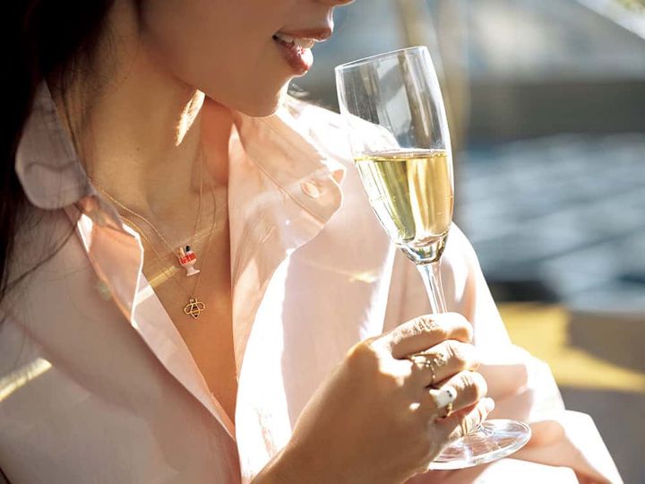 遊び心をさりげなくアピール! ハチが甘いカクテルを狙っているような重ね着けがキュート。
