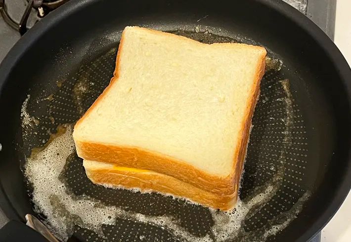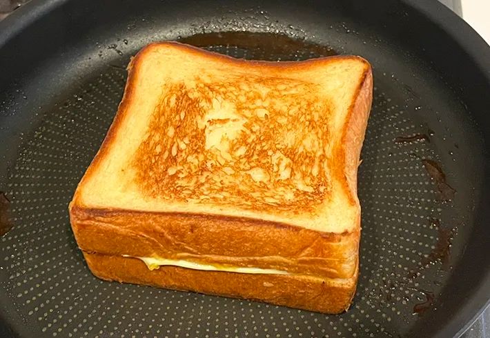 ホットサンドメーカーは不要で、フライパン1つで手軽に作れますよ。
