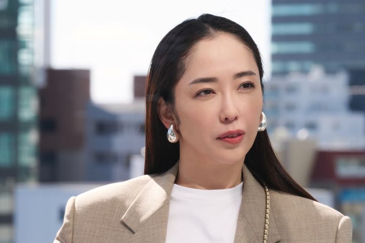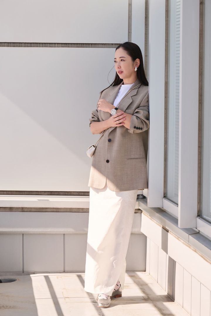 ザ・ロウのジャケットとTシャツに、ヨー ビオトープのスカート。足元はマルティニアーノのシルバー靴を合わせ、洗練された春の出で立ちに。「サロン経営者が集う会など、大人数が集まる華やかな会場では、人目をひくような明るい色の服を着ることが多々。爽やかさや清潔感とともに、品の良さを大切にしています」