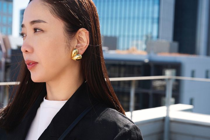 顔周りにインパクトを添えるボッテガ・ヴェネタのボリュームピアス。「強さと華やかさを同時に叶えてくれるゴールドカラーのピアスは、ついつい手に取ってしまいます。アイコニックなドロップフォルムが連なることでハートのフォルムを描き出したチャーミングなデザインにもときめきます」