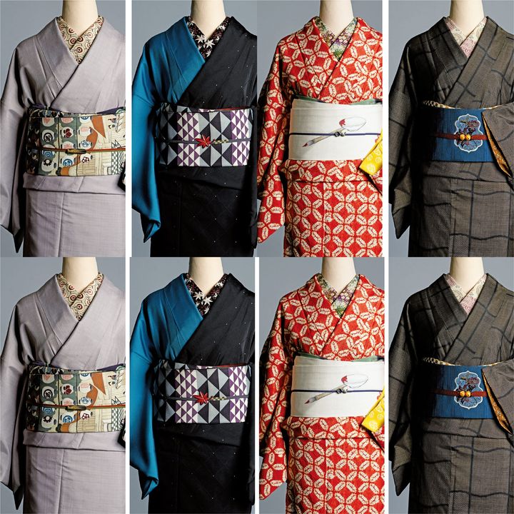 色柄だけでなく素材感によっても印象が変わる半幅帯。ここでは、その一例を紹介するとともに、“貝の口” と“割り角出し”2種の帯結びをレクチャー。「ルールはないので、自分が「よい」と思えるのがいちばん!」と石田さん。