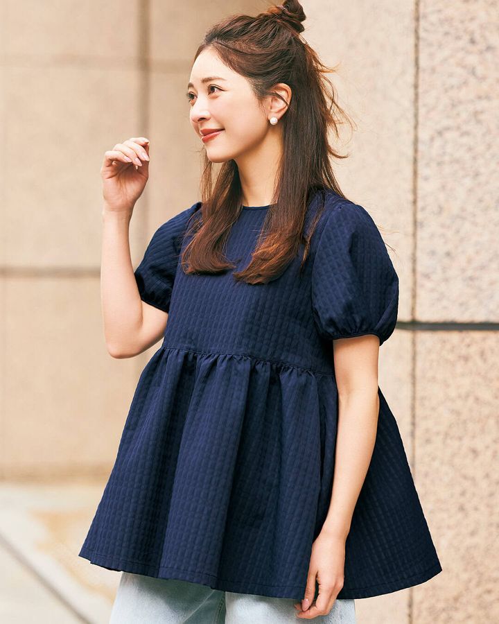 一見シンプルながらチェック柄のように見えるジャカード素材が春らしい。タック入りの袖のパフスリーブが二の腕をカバーし、胸下の切り替えでスタイルアップ効果も。ポコポコとしたジャカード織りが柄見えして華やかで、後ろファスナーだから首周りがスッキリ見えます。自宅でのイージーケアが可能。