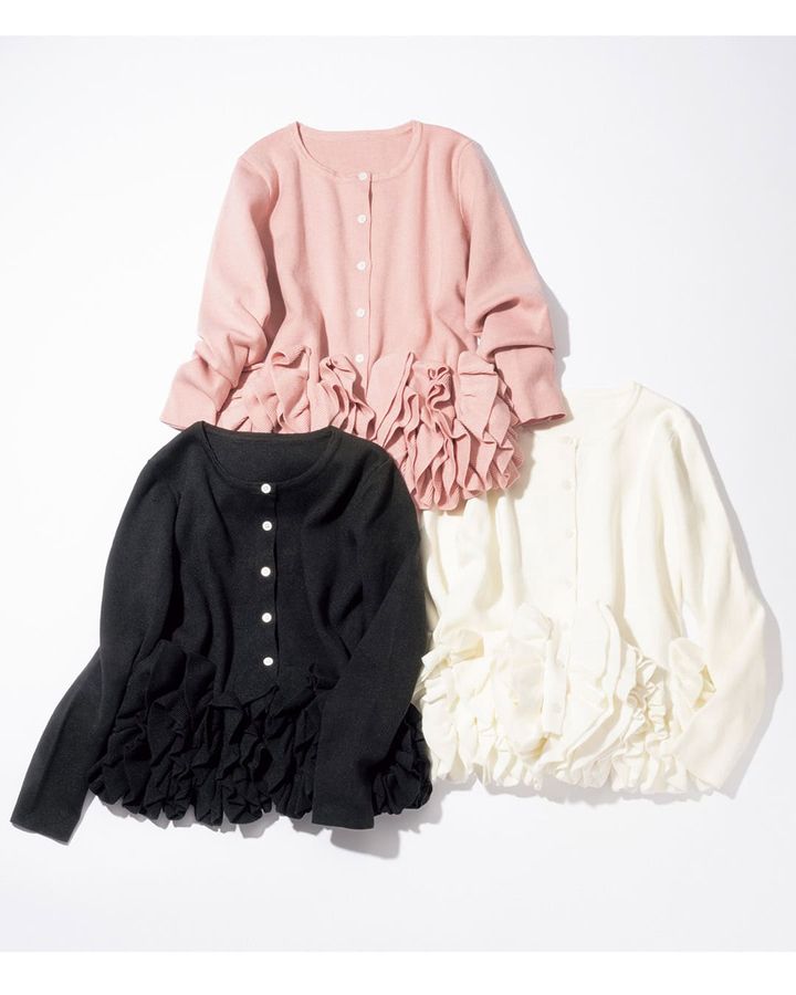 フリル裾ニットカーディガンは、軽やかでありながらしっかりした生地感が魅力の一枚です。腰回りのフリルが可愛らしさを演出し、シンプルなコーディネートにも華やかさをプラスしてくれます。薄手なので、これからの季節にぴったりで、重ね着にも最適です。スラックスともデニムとも相性抜群、上品見えするカーディガン。