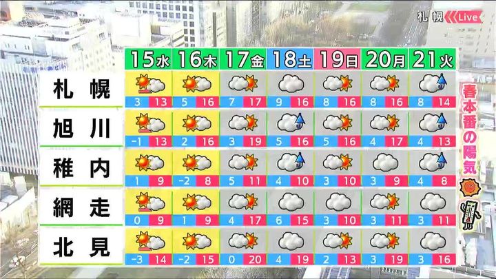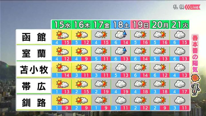 春本番の陽気の日が多く、金曜は札幌で17度、北見で20度まで気温が上がります。土曜は北部を中心に雨が降りますが、降り方は弱いでしょう。