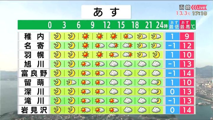 薄い雲を通して、昼頃まで日が差すでしょう。朝は倶知安や千歳で0度まで気温が下がりますが、日中は10度を超えるでしょう。
