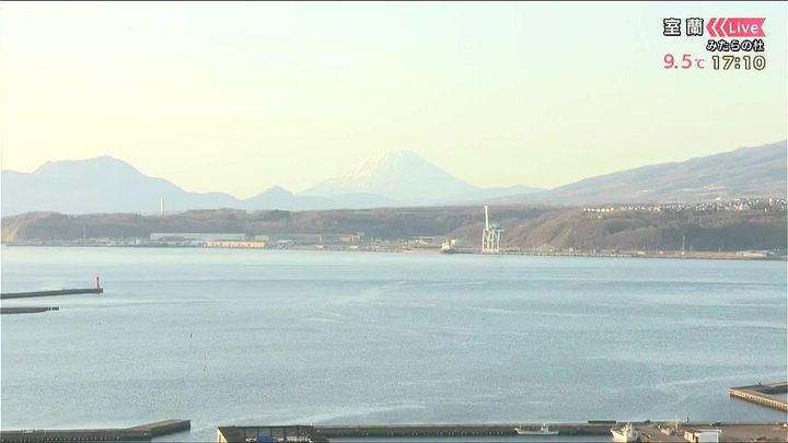 室蘭から50キロ以上離れてる、雪の帽子をかぶった羊蹄山がうっすら見えます。