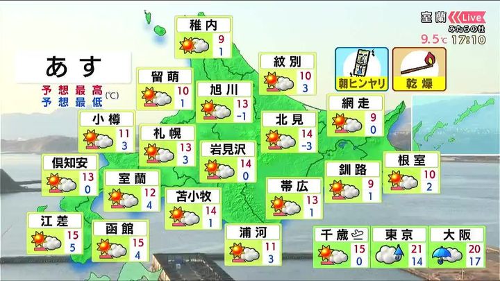 雲の隙間を通して日差しが届くでしょう。風は弱まる見込みです。最高気温は広く2ケタですが、朝は0度近くまで下がり、旭川は‐1度、北見は‐3度とヒンヤリします。空気の乾燥にも注意して下さい。