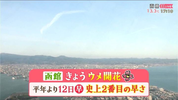 春の陽気できょう14日(火)、函館ではウメが開花しました。平年より12日早く、史上2番目の早さでの開花となりました。