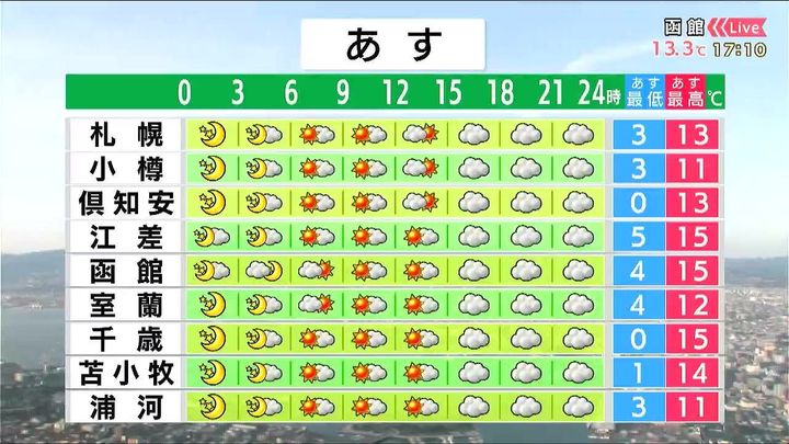 あす15日(水)の時間ごとの天気。道央・道南からです。