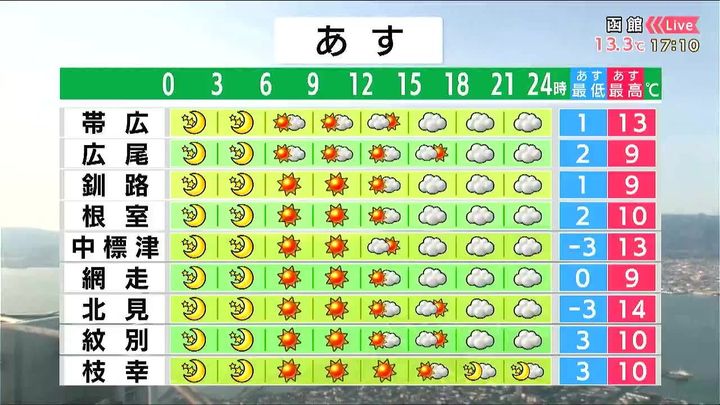 朝は晴れますが、帯広など午後はしだいに曇るでしょう。空気の乾燥が続きます。最高気温は平年並みか3度ほど高くなるでしょう。