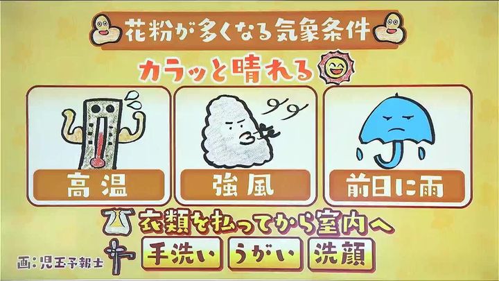 上着を払ってから家に入る、手洗い、うがい、洗顔をするなど、室内に花粉を持ち込まないようにしましょう。天気のひとホリでした。