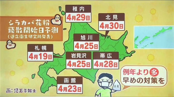 例年より3日前後早くなりそうです。道立衛生研究所が発表したシラカバ花粉の飛散開始日予測です。