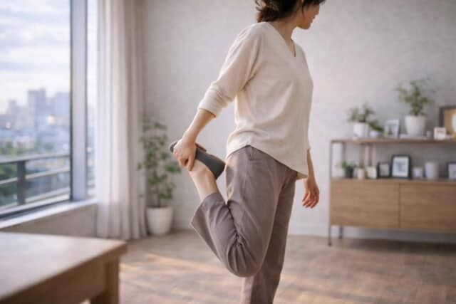 このとき、腰を反らせすぎず、骨盤を立てる意識を持つことで、股関節の前側にしっかりと伸びを感じやすくなります。強く引っ張る必要はなく、呼吸を止めずに自然な範囲で行うことが大切です。