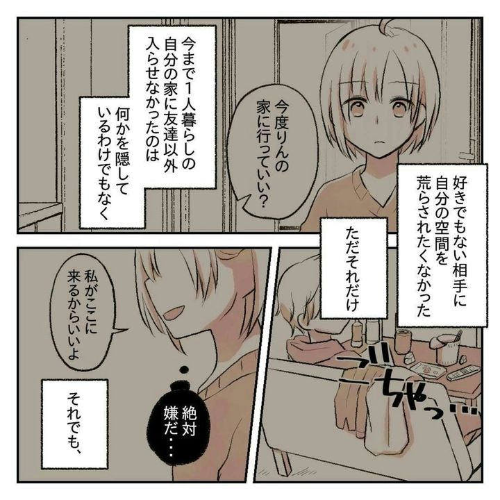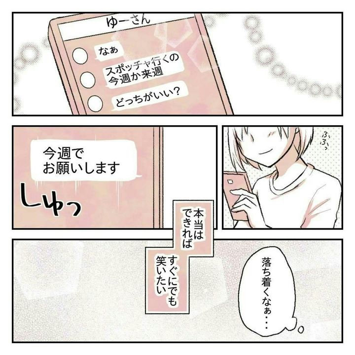 その後、会社の先輩・ゆーさんから遊びの誘いの連絡がきます。いつの間にか、りんさんにとってのゆーさんは、苦手な職場の先輩ではなく、落ち着く存在へと変化しているようです。