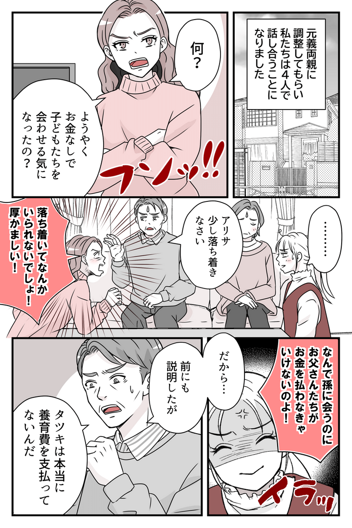 元義両親に調整してもらって、私たちは4人で話し合うことになりました。元義両親の前でも臆することなく主張を繰り返すアリサさんに、私はさっそくため息をつきたくなりました。アリサさんの主張に反論しようかと思いましたが、それより先に元義両親が静かに、しかし毅然とした態度で話し始めます。