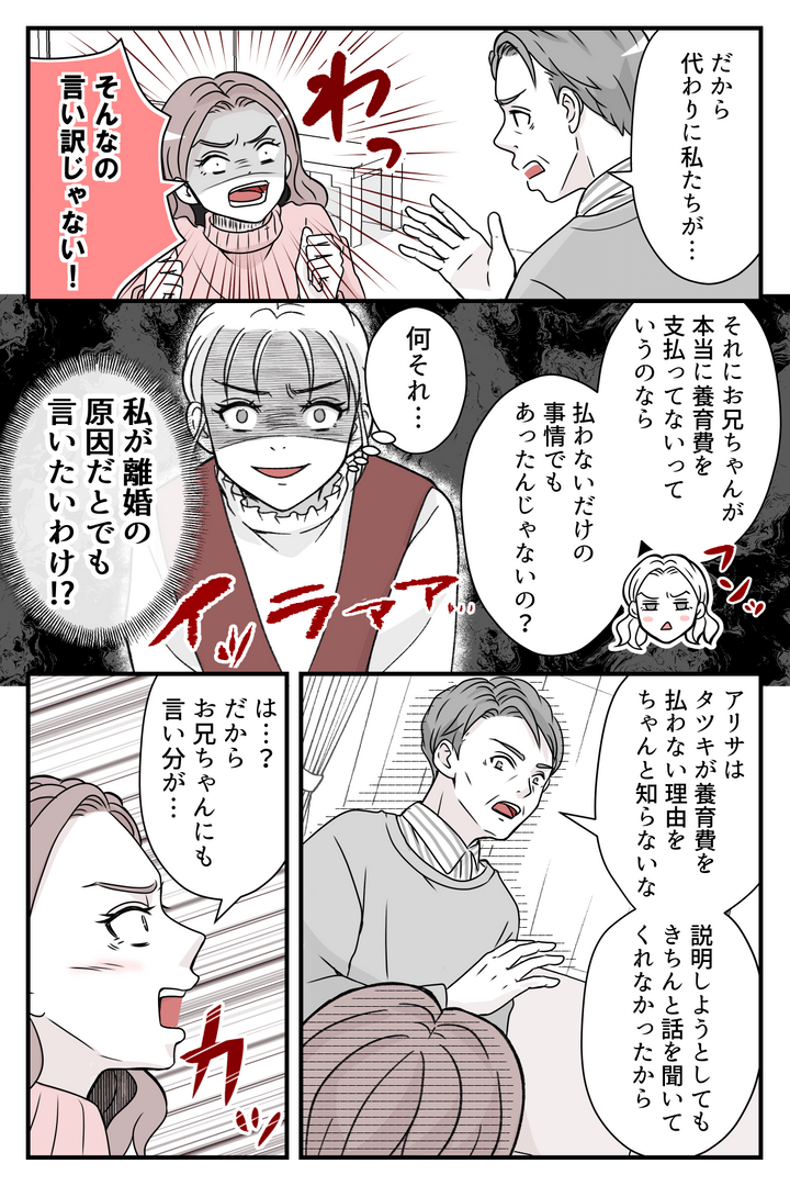 離婚の原因は妻側の私にある、と言いたげなアリサさんに、義両親はタツキがギャンブルにハマっていたことが原因だと説明しました。しかしそれでもアリサさんは「お兄ちゃんはそんな人じゃない!」と言う始末。そこで私からもタツキのしてきたことを冷静に伝えます。アリサさんの顔が青くなっていきました。