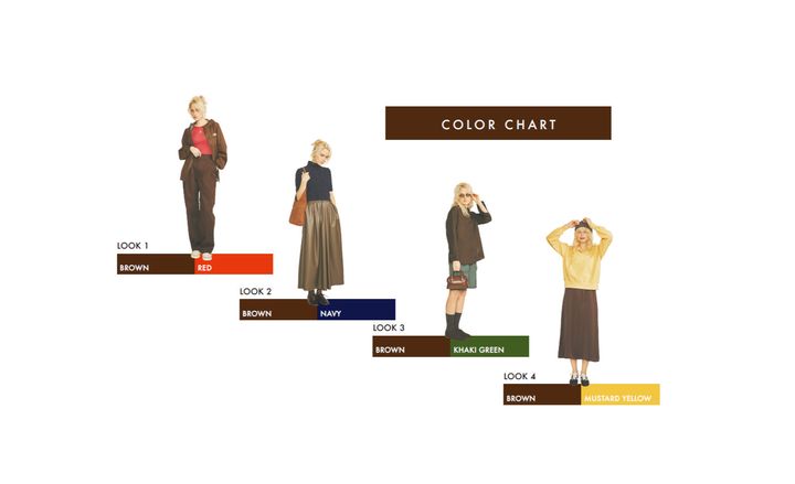 白やベージュより落ち着きがあり、黒よりもマイルドに整う。ベーシックカラーの中でもブラウンとなら、気になる色と距離を縮めるのも簡単。どんな色でも穏やかに受けとめられる、懐の深さに甘えて、ワンパターンから抜け出すための、新たな配色パレットをご提案。