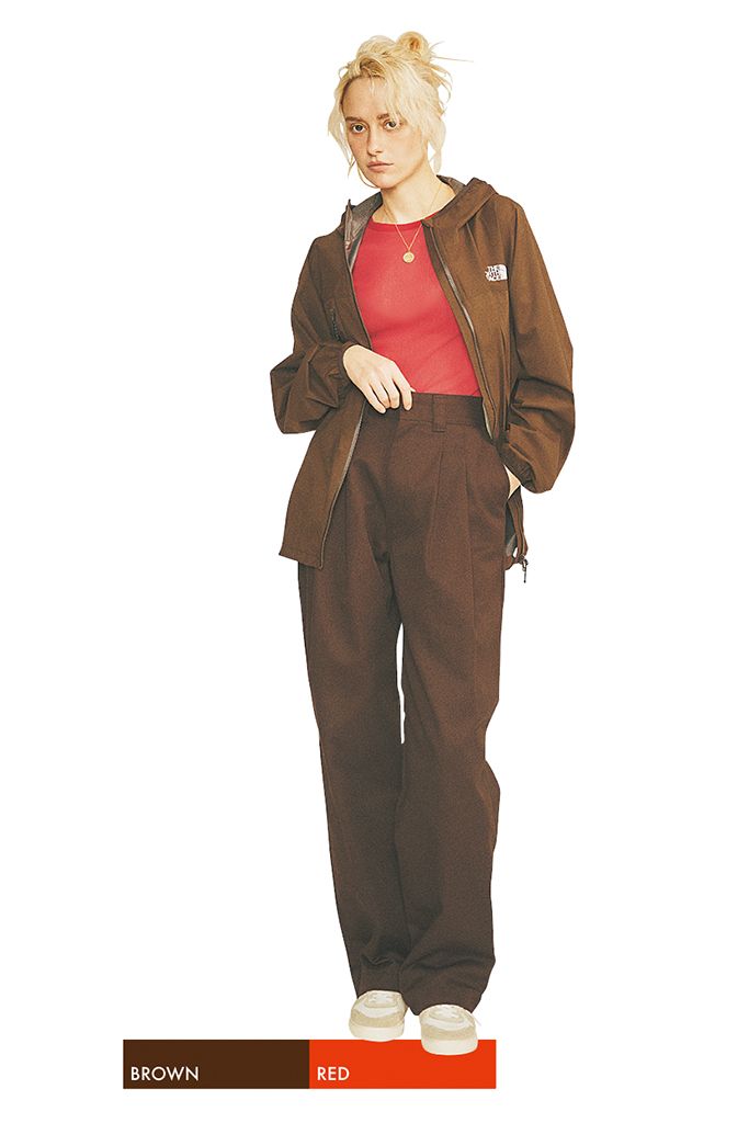 ブラウンレインジャケット/ザ・ノース・フェイス(ゴールドウイン カスタマーサービスセンター) ブラウンパンツ/THE SHINZONE(Shinzone ルミネ新宿店) 赤Tシャツ/PISCESS(ジャック・オブ・オール・トレーズ プレスルーム)