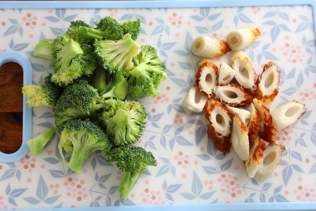 【1】ブロッコリーは一口大、ちくわは斜め切りにする。ブロッコリーのみ電子レンジ(600W)で3分加熱する。