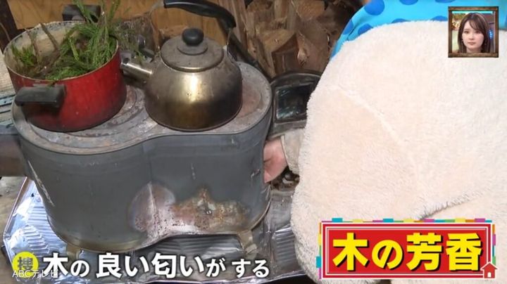普段は一般的な天井高の部屋で、薪ストーブとファンヒーターを使用。ストーブは林業で出た端材を薪にして使い、廃油で作る自家製の着火剤で火を付ける。ストーブの上の鍋では杉の葉を湯煮。暖気で出てくるカメムシの防虫・防臭をしている。