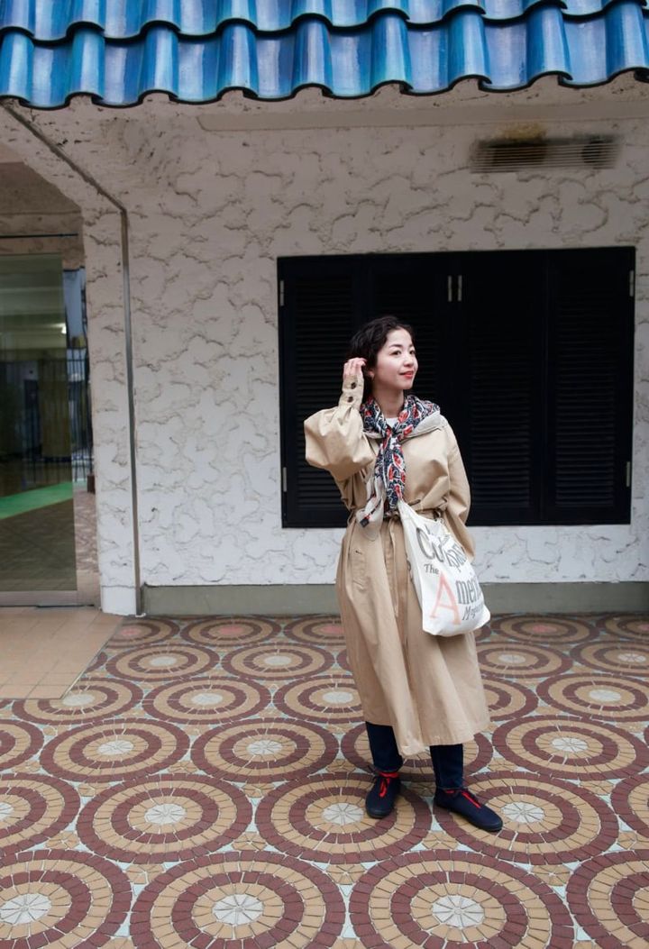 春になると着たくなるトレンチコートをメインにスタイリング。インドで購入した柄スカーフをONするだけで、洒落感アップ。ソックス&シューズもスカーフと同じネイビーと赤の配色にして統一感を出しています。