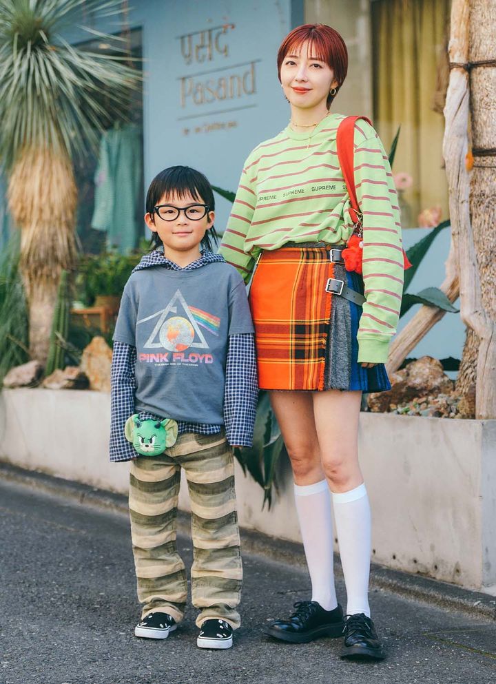 ヴィンテージのバンドTやチェック柄スカートを取り入れて、ロックな世界観をシェアした親子コーデがおしゃれ! 一見難しい柄オン柄スタイルは、トーンを合わせることで統一感ある装いになる。