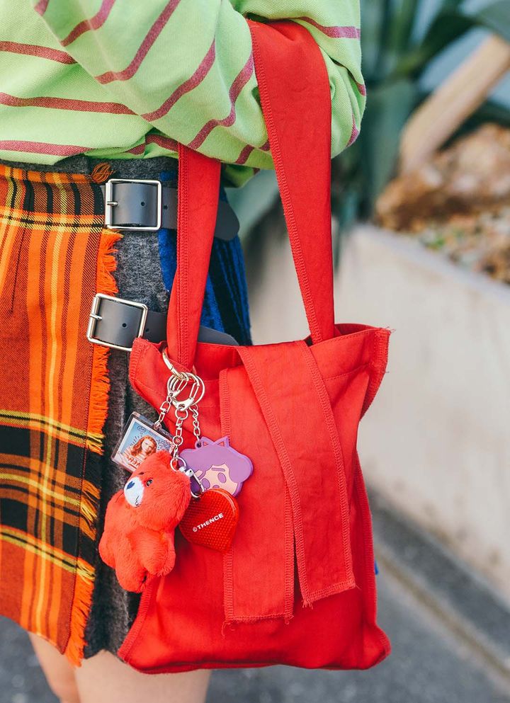 ミニマムながらひと癖あるトートバッグは『イッチ』のもの。自分の好きなものを詰め込んだ、バッグチャームアレンジに注目!