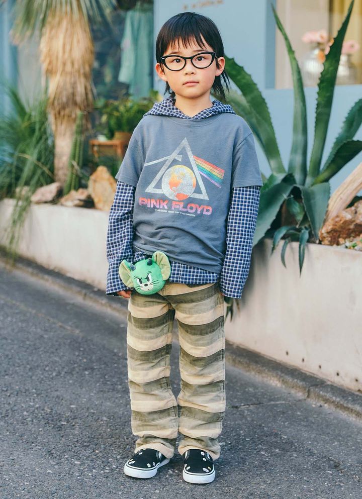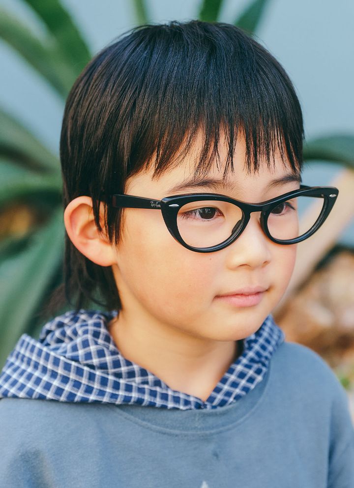 『レイバン』のフォックス型メガネがモードな印象をプラス。チェック柄のフーディーシャツの襟元が覗かせて、大人顔負けのこなれた着こなしに。