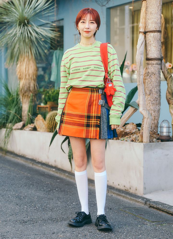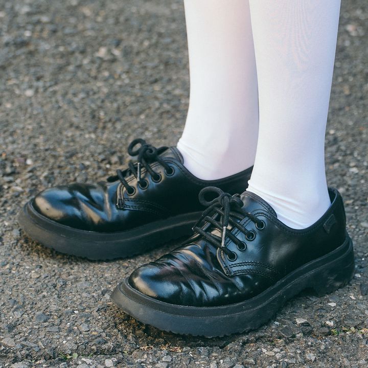 ホワイトのハイソックスにブラックシューズを合わせた足元。チェック柄スカートと合わせて、クラシカルなスクールガール風に昇華!