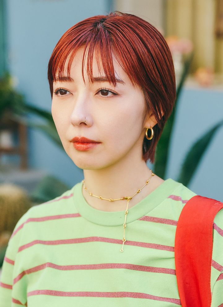 オレンジレッドをチャージしたショートヘアが最高にクール! ゴールドの『ローラロンバルディ』のネックレスが顔周りを華やかに彩って。