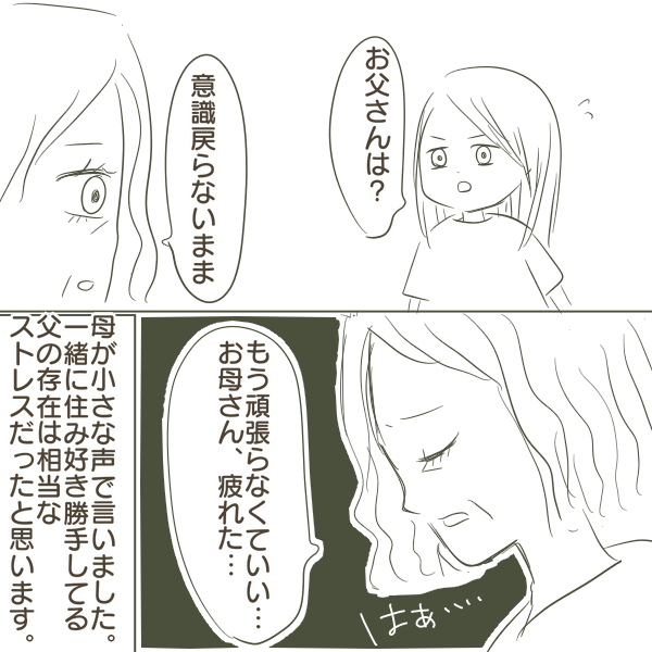 父が倒れたと連絡があったのです。この時点で意識はなく危ない状態でした。しかし、頑張ってほしいという気持ちはなく、母も同じ気持ちだったようです。近所の人にも不倫を目撃され、好き勝手している父と暮らす母のストレスは計り知れないものだったと思います。そして父は意識が戻らないまま、2日後に息を引き取りました。